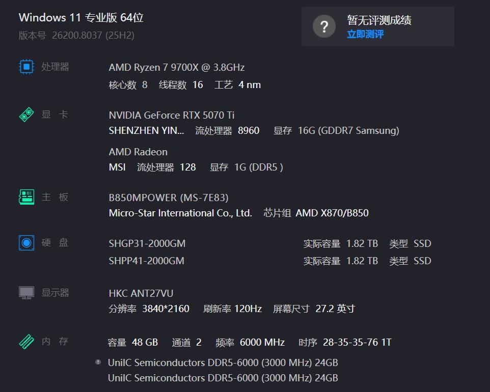 配置如图,考虑到对画质有追求的用户,整机搭配选择了9700X+5070Ti的核心组合,确保CPU没有瓶颈以及顺利开启“路径追踪”,达到最佳的光影效果。