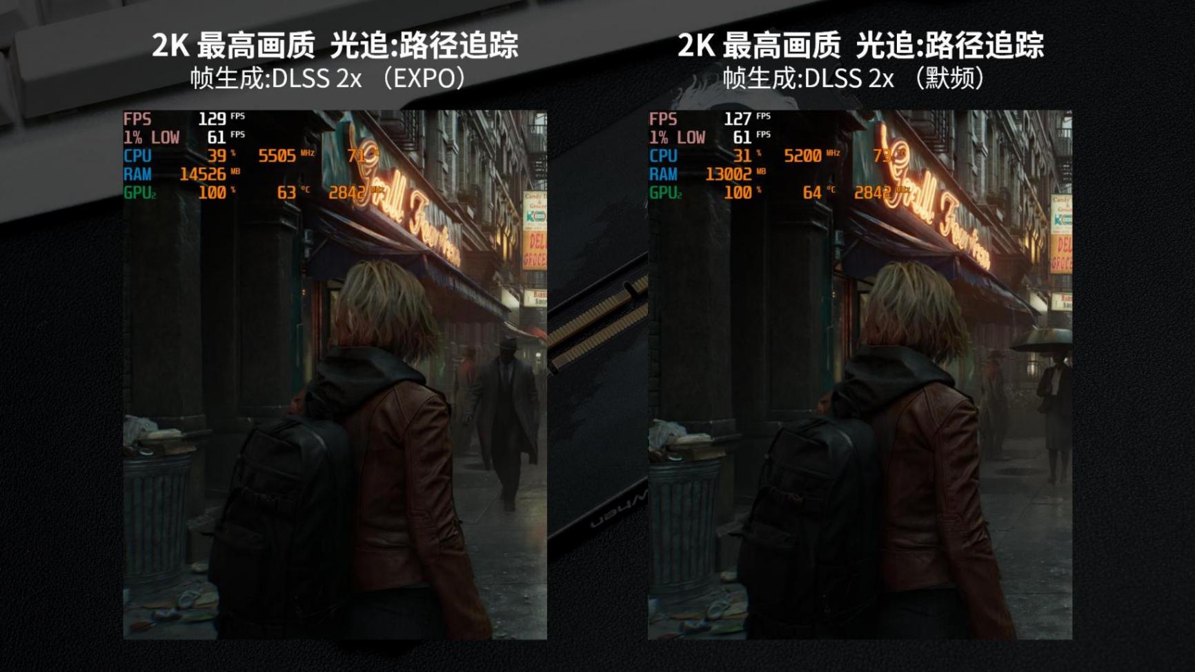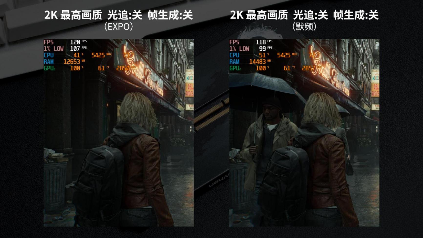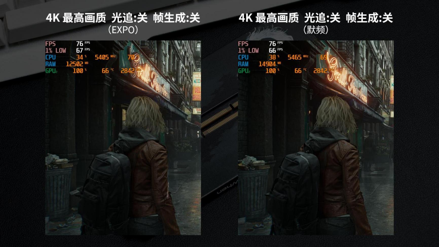先看纯光栅性能表现,在手动开启最高画质预设下,不管是4K还是2K场景测试,EXPO和默频状态都能保持在60FPS以上的及格线,流畅玩耍完全没有问题。不过整体超频后的帧率要优于默频状态,其中2K场景的Low帧多出了8FPS。