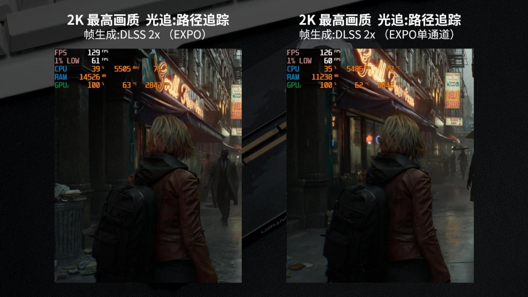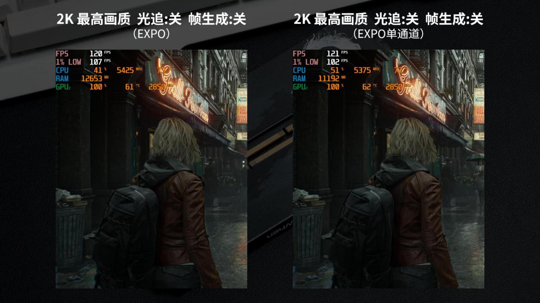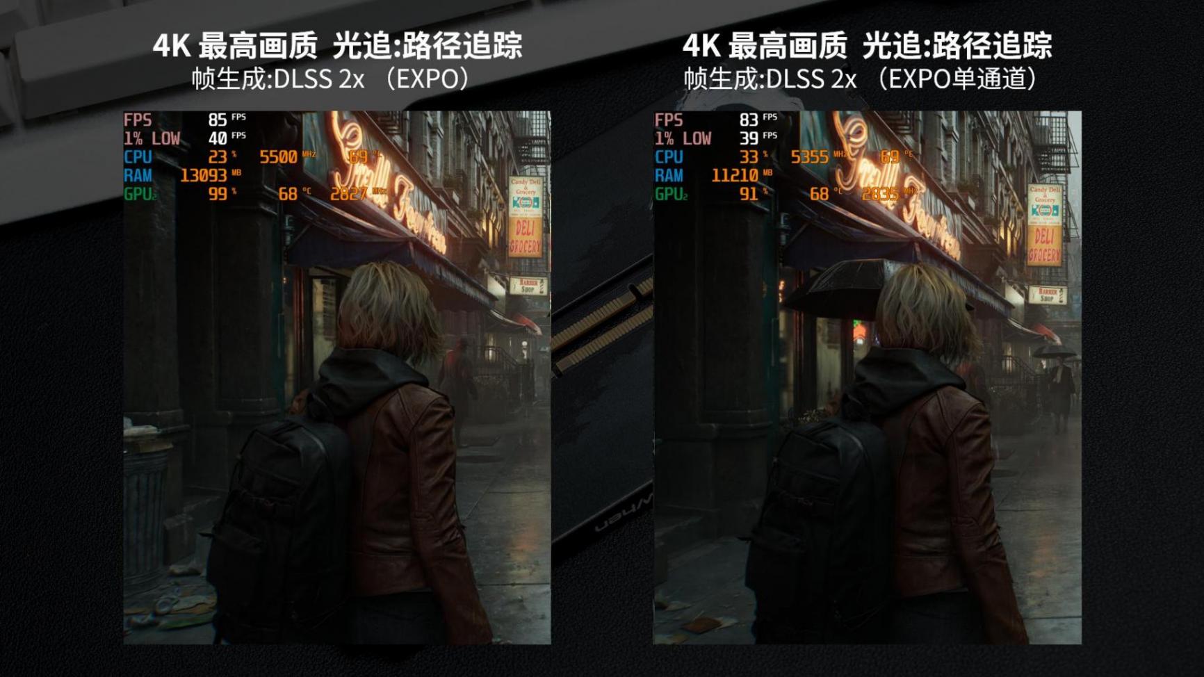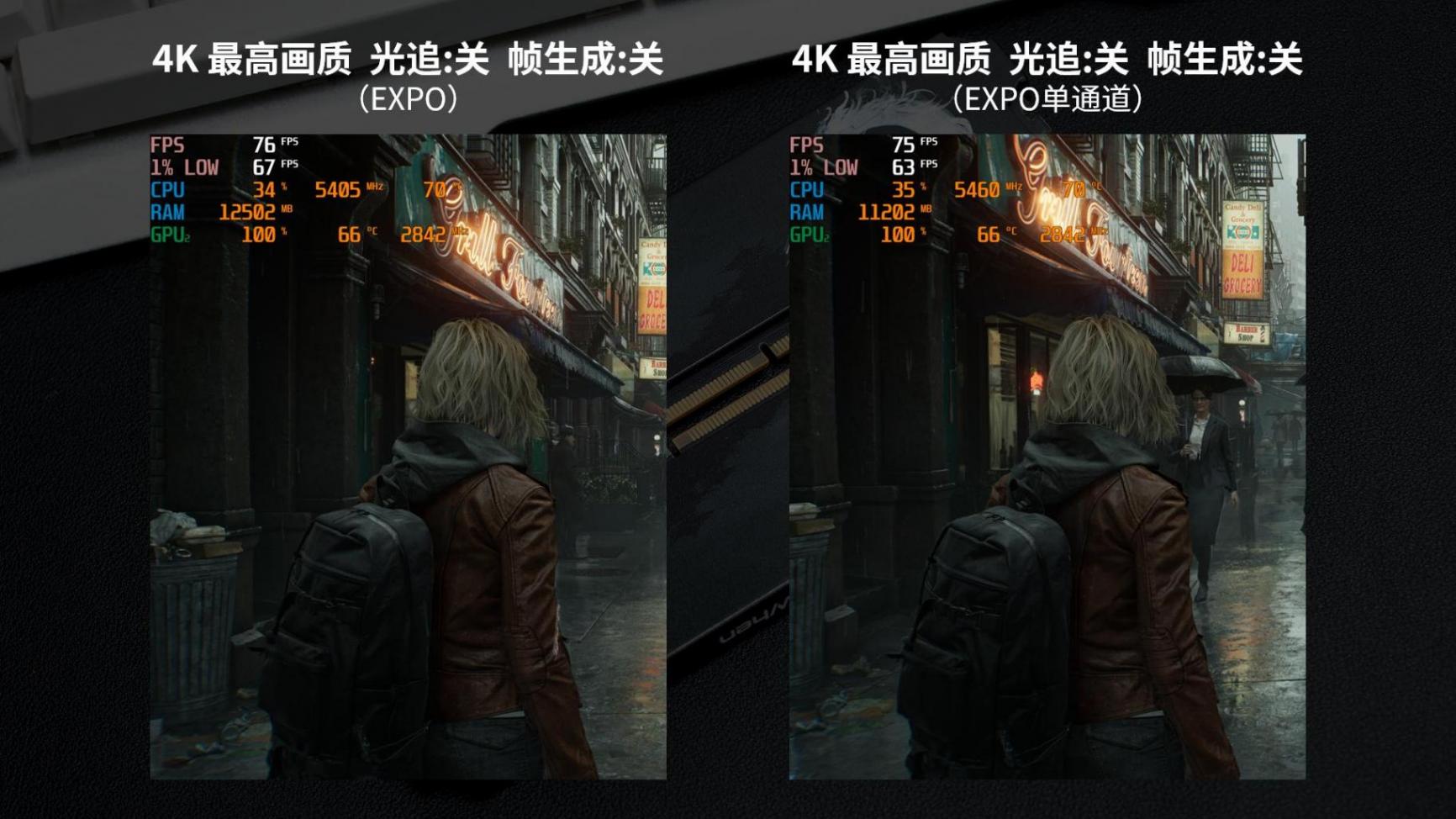 先看纯光栅性能表现,在手动开启最高画质预设下,不管是4K还是2K场景测试,EXPO和默频状态都能保持在60FPS以上的及格线,流畅玩耍完全没有问题。不过整体超频后的帧率要优于默频状态,其中2K场景的Low帧多出了8FPS。