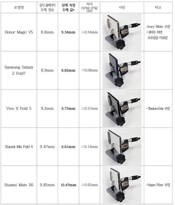 然而,韩国消费者中心企业协会(Korean Consumer-Centered Enterprise Association,简称 KCEA)发布了一项独立研究,该研究对比了 Galaxy Z Fold7 与荣耀 Magic V5、华为 Mate X6、vivo X Fold 5 和小米 Mix Fold 4 等多款顶级竞争对手的厚度,结果显示各手机实测厚度如下:
