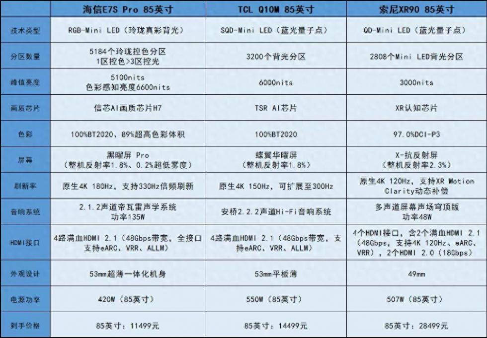 从三款产品的对比来看,索尼XR90优势在日系品牌的长期信仰上,TCL Q10M的核心优势是极限峰值亮度,而海信E7S Pro则在技术代际与综合配置上实现了全面拉满。