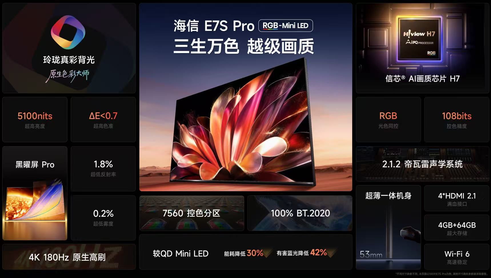 海信E7S Pro作为RGB-Mini LED技术的爆款产品,搭载RGB-Mini LED玲珑真彩背光技术,摒弃了传统“单色背光+二次色彩转换”的模式,通过红、绿、蓝三原色芯片独立发光,从光源源头减少色彩损耗,在色彩纯度与控光精度上实现了质的提升,这也是该技术被全球公认为新一代液晶显示技术的核心原因。硬件配置上,5184个玲珑控光控色分区,像素级的精准控光控色让画面层次感与立体感尤为突出,5100nits峰值亮度搭配6600nits的色彩感知亮度,兼顾亮场表现与色彩还原。