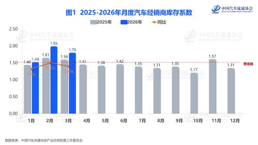 2026年4月14日,中国汽车流通协会发布2026年3月“汽车经销商库存”调查结果:3月汽车经销商综合库存系数为1.76,环比下降9.7%,同比上升12.8%。