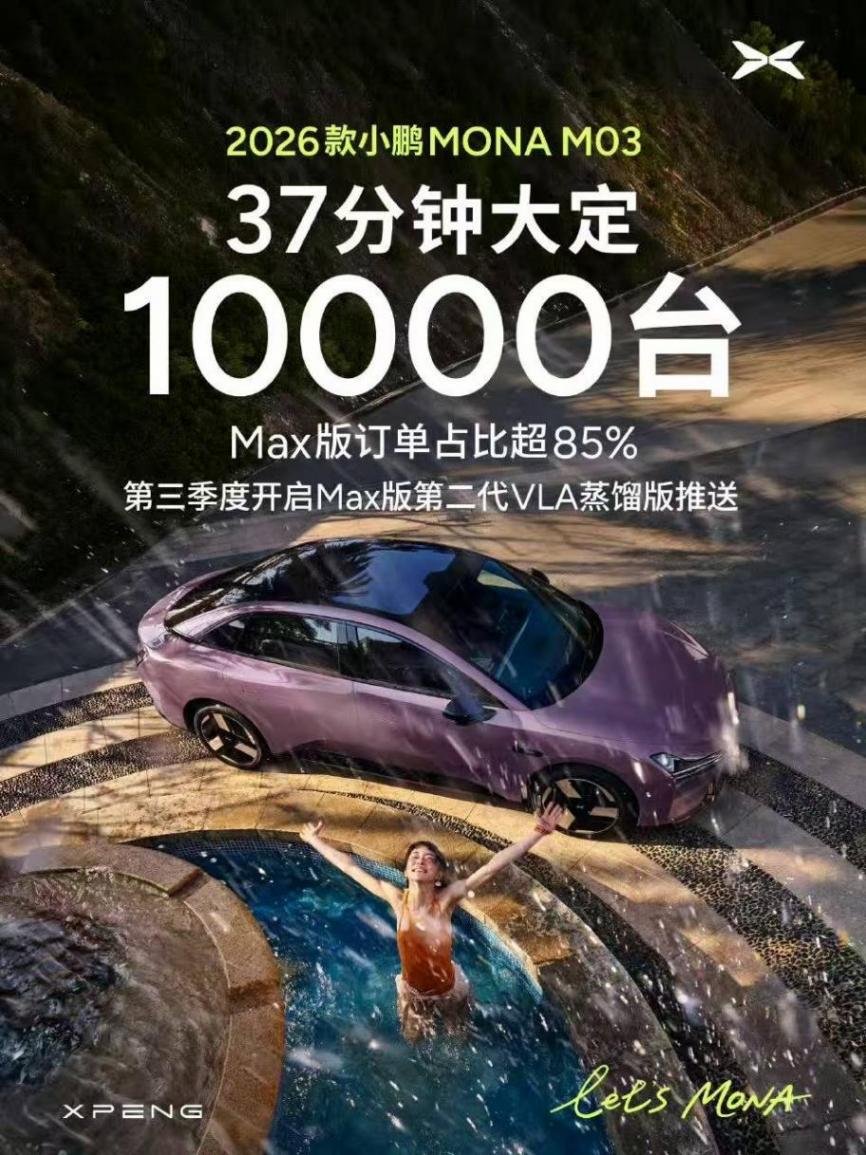 2026款MONA M03的焕新上市,进一步巩固了市场优势。新车在续航、内饰、智能化等方面全面升级,上市37分钟大定订单便突破万台,Max版本订单占比超85%,持续领跑细分市场。这款车型早已成为小鹏的销量支柱,2026年3月小鹏单月交付量环比增长80%,M03贡献了主要增量,成为品牌销量增长的核心引擎。