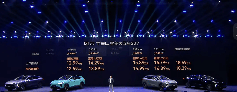 产品方面,风云T9L搭载鲲鹏超能电混CDM 6.0系统,四驱版零百加速进入5秒级,综合续航超过2000km,搭载猎鹰700智驾系统拥有560TOPS算力,卖相很不错。