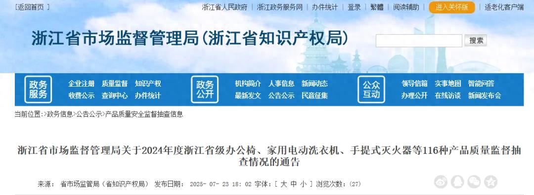 近日,浙江省市场监督管理局发布2024年度省级办公椅、家用电动洗衣机、手提式灭火器等116种产品质量监督抽查情况。本次共抽查5867批次产品,检出826批次产品不合格。