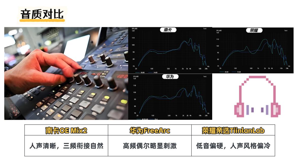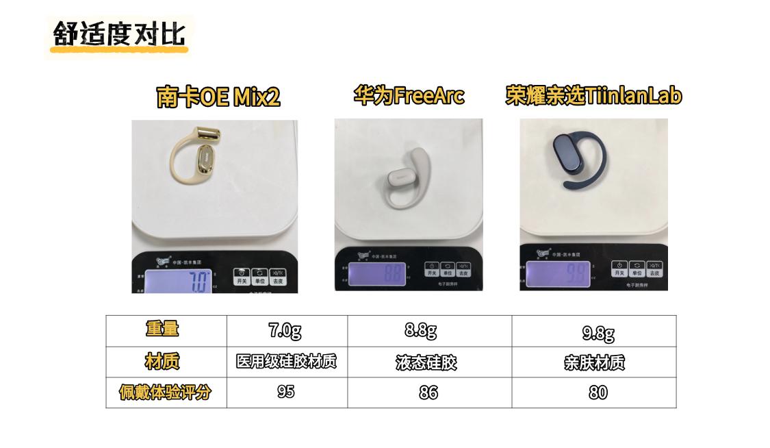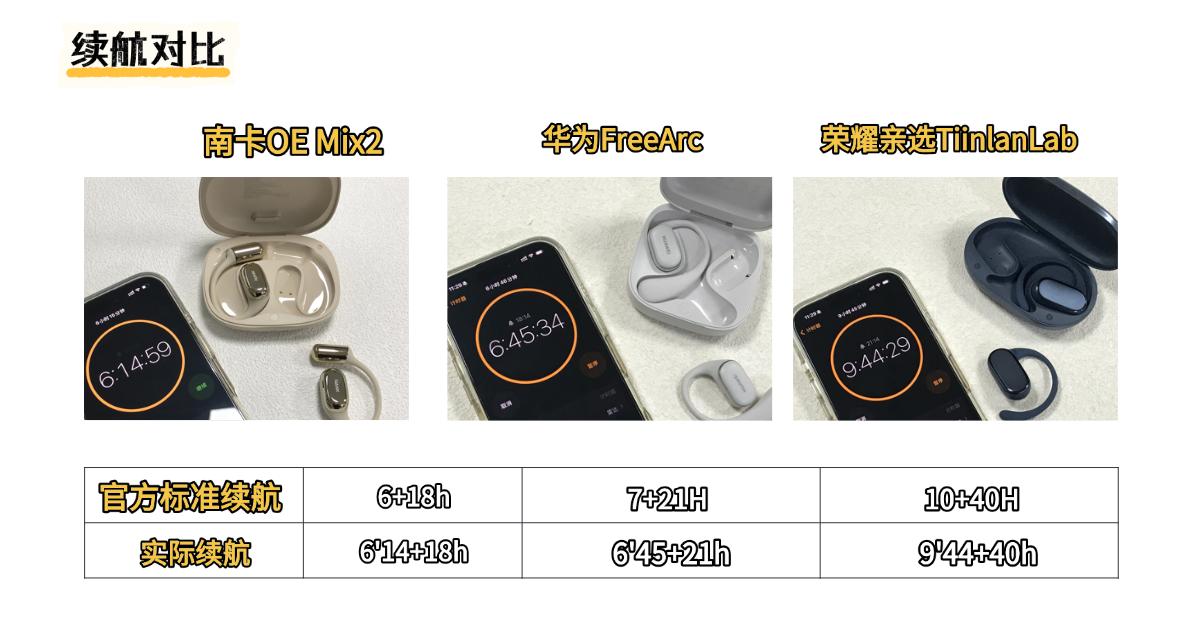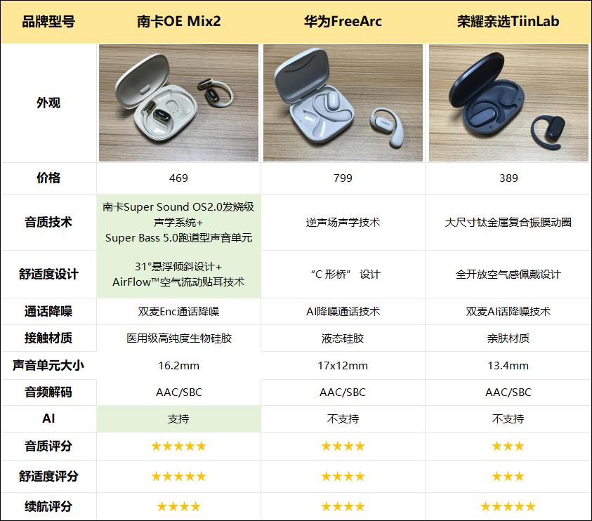 为了帮大家避坑,我们找来了三款最近讨论度很高的型号:南卡OE Mix2、华为FreeArc,还有荣耀亲选TiinLab。接下来我们将从佩戴感受、音质表现、漏音等方面进行实测对比,把它们掰开揉碎仔细对比,帮助大家弄明白哪款才是真正适合你的那个。
