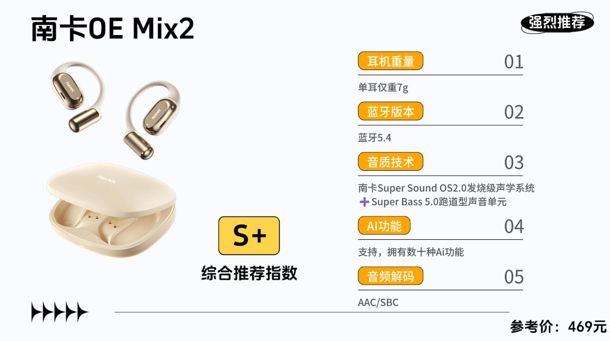 南卡作为拥有十余年音频研发技术的品牌,坚持“技术为本、体验优先”的研发路线,靠产品实力获得了不少专业测评师、HiFi发烧友与运动达人的喜爱和推荐。而这款OE Mix2作为南卡新一代的百元满配耳机也是完美地展示了这一点,不仅在舒适度、音质漏音表现以及功能配置等方面做到百元价位没有对手,并且还全新加入了AI智慧系统,带来不一样的开放式耳机听音体验!