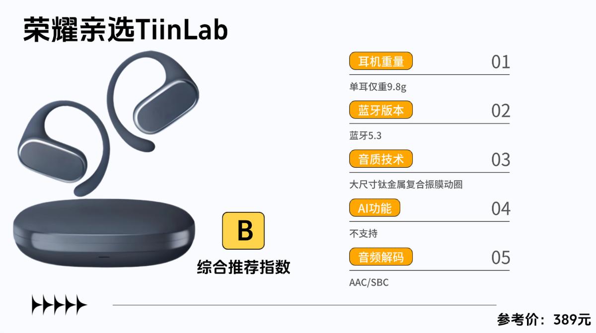 荣耀亲选TiinlanLab耳机采用一体式耳挂设计,结构简单,搭载13.4mm大尺寸钛金属振膜动圈单元。荣耀支持蓝牙5.3,续航方面的表现不错,单耳能使用10小时,配合充电盒使用40小时。