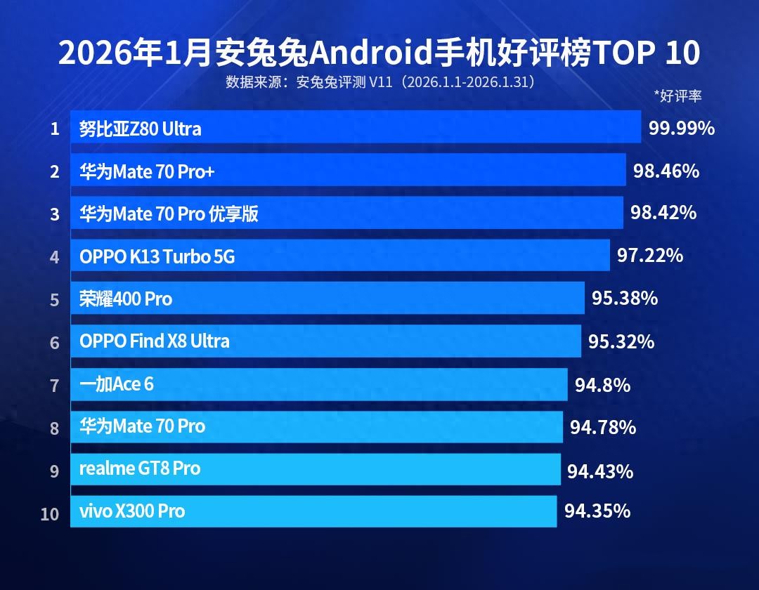 2026年1月安兔兔安卓手机好评榜正式发布,小众品牌努比亚旗下Z80 Ultra意外登顶榜首,华为Mate70系列三款机型跻身前十,中端机OPPO K13 Turbo也凭借独特功能闯入前五。这是否意味着手机行业的竞争逻辑正在从"全面堆料"转向"精准击中需求"?