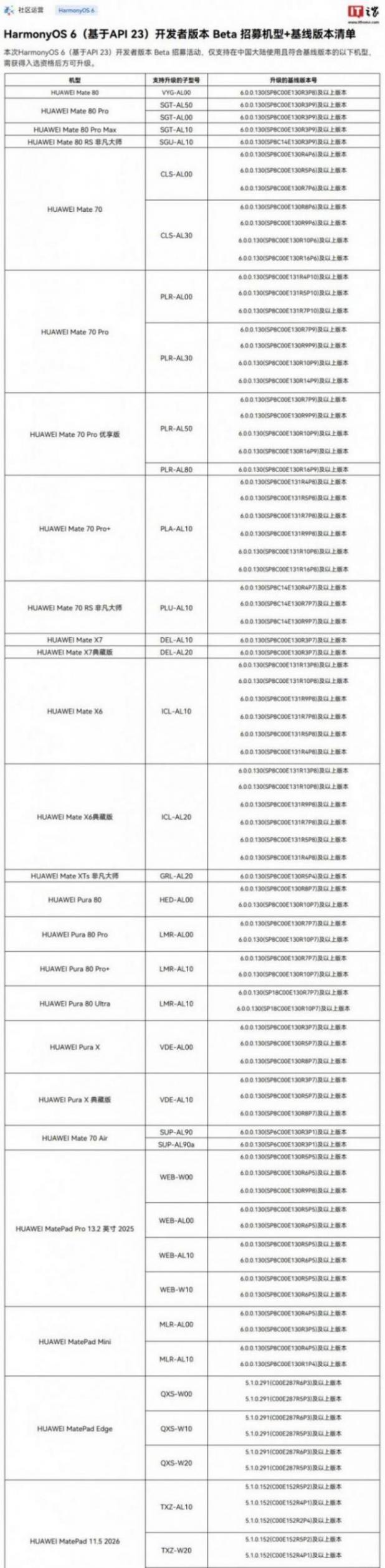 本次 HarmonyOS 6(基于 API 23)开发者版本 Beta 招募活动,仅支持在中国大陆使用且符合基线版本的以下机型:HUAWEI Mate 80 系列、HUAWEI Mate 70 系列、HUAWEI Mate X7 系列、HUAWEI Mate X6 系列、HUAWEI Mate XTs 非凡大师、HUAWEI Pura 80 系列、HUAWEI Pura X 系列、HUAWEI MatePad Pro 13.2 英寸 2025、HUAWEI MatePad Mini 系列、HUAWEI MatePad Edge、HUAWEI MatePad 11.5 2026。
