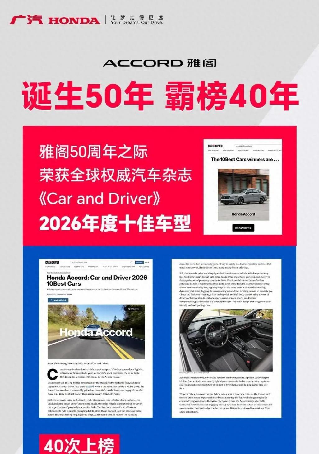 再往前推。雅阁今年迎来全球诞生50周年,同一年,它第40次入选《Car and Driver》年度十佳车型。这类海外评选不负责卖车,只负责长期横向对比。能反复上榜,说明它在不同时代的规则下,都没掉队。你可以不关心奖项,但它至少提供了一个外部坐标:这车不是只适配某一代审美或某一轮技术风口。