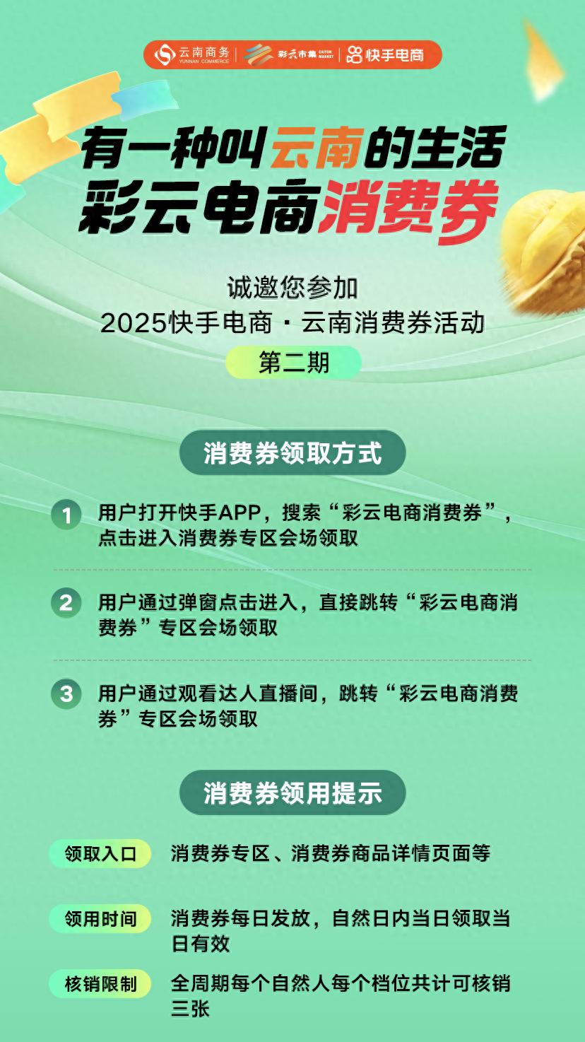 用户登录快手APP,搜索“彩云电商消费券”或“云南消费券”,或通过弹窗、达人直播间跳转活动专区,即可领取消费券,至高享满300减50优惠。消费券每日发放,当日领取当日有效,全周期内每个自然人每个档位可核销三张。