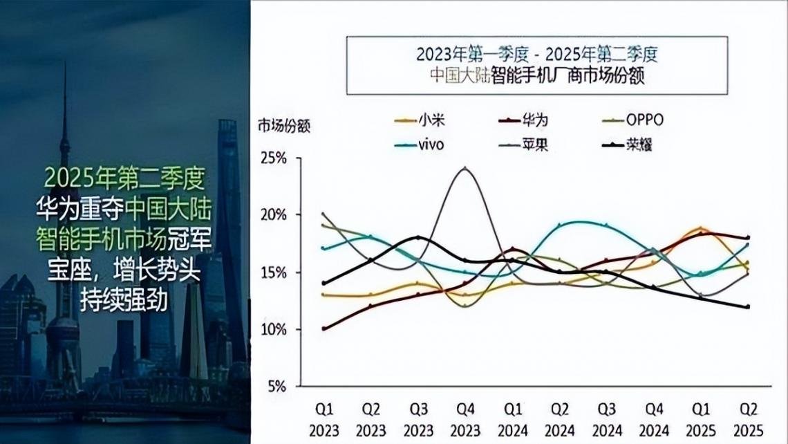 2025年二季度国产机销量集体扑街,6780万台的出货量比去年又少了4%,结果华为硬是靠着15%的增长把第一宝座抢回来了。
