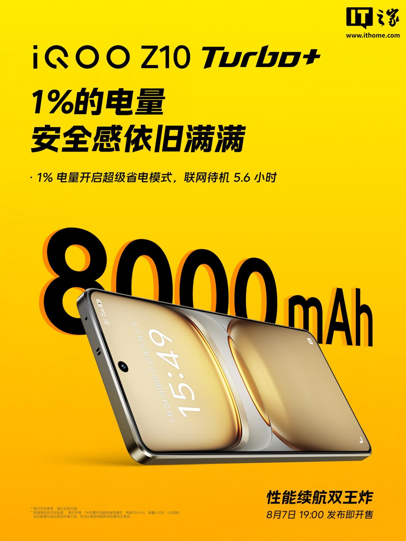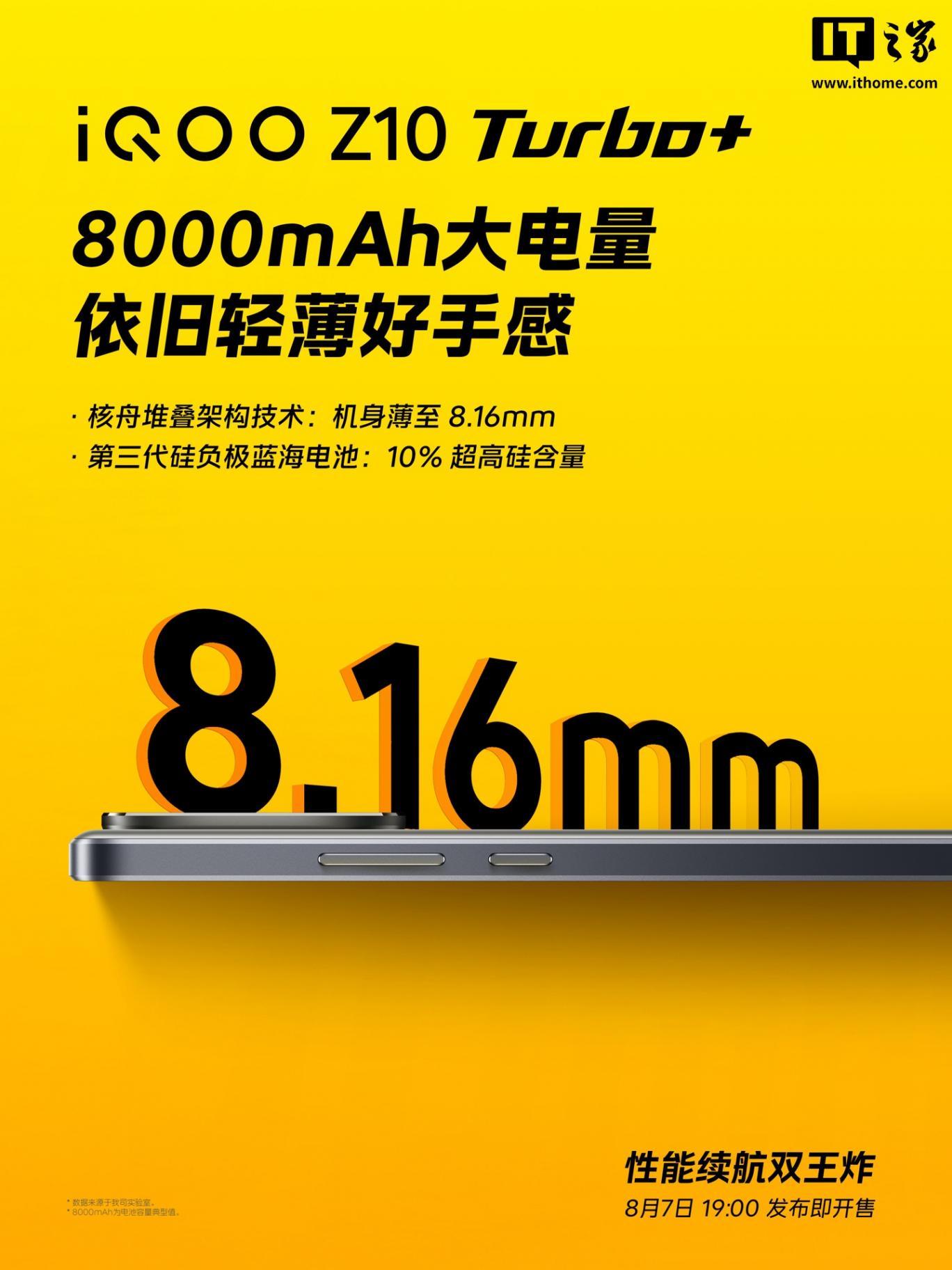 7 月 31 日消息,iQOO 手机今日宣布,iQOO Z10 Turbo+ 手机 8 月 7 日 19:00 发布即开售,号称“行业唯一 8000mAh & 天玑 9400+ 性能机”。