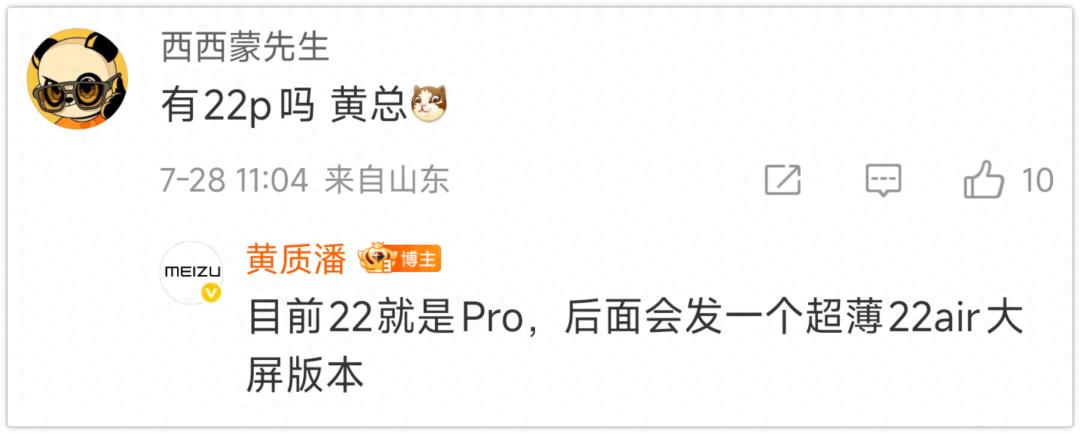 7月29日,网友直接“灵魂拷问”魅族CEO黄质潘:“有魅族22 Pro吗?”黄总淡定回应:“目前22就是Pro,后面还有个超薄22 Air大屏版本!”