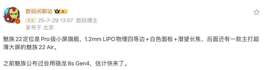 博主@数码闲聊站 这边则带来了略有不同的爆料,他表示魅族22定位是Pro级小屏旗舰,1.2mm LIPO物理四等边+白色面板+潜望长焦,后面还有一款主打超薄大屏的魅族22Air,之前魅族公布会用的骁龙8sGen4,估计快来了。