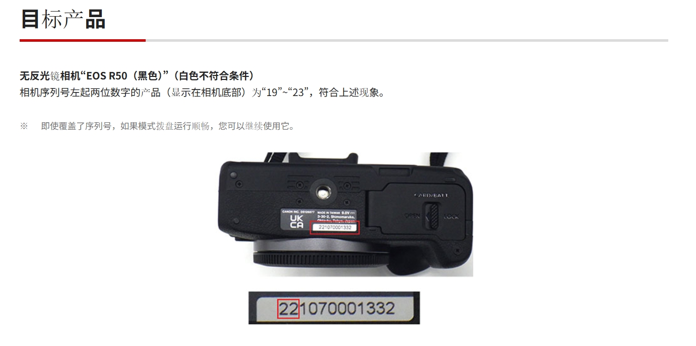 佳能宣布将对部分批次的“EOS R50”黑色型号进行免费维修。因为相机的模式拨盘的作可能会变得沉重或损坏并脱落。公告称:“非常感谢您一直以来对佳能产品的惠顾,无反相机“EOS R50(黑色)被发现会出现以下现象。我们想通知您此事的细节和我们的回应。对于由此给使用本产品的客户带来的任何不便,我们深表歉意。今后,我们将继续彻底控制质量,以便我们的客户可以放心使用,因此我们请求您的理解。相机序列号(显示在相机底部)左起两位数字为“19”~“23”的产品符合条件。免费维修受理期至 2028 年 7 月 31 日。维修期限大约需要 10 天 ~ 2 周。 ”