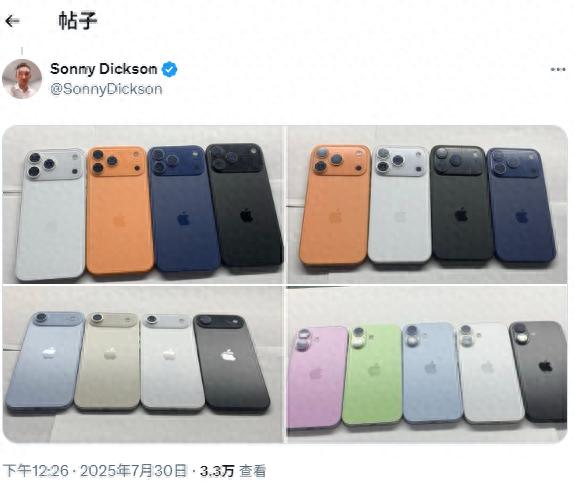 7月30日,博主@Sonny Dickson分享了一组iPhone 17的机模照片,展示了新机的多款配色,其中橙色首次出现。