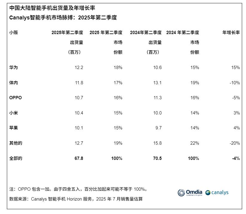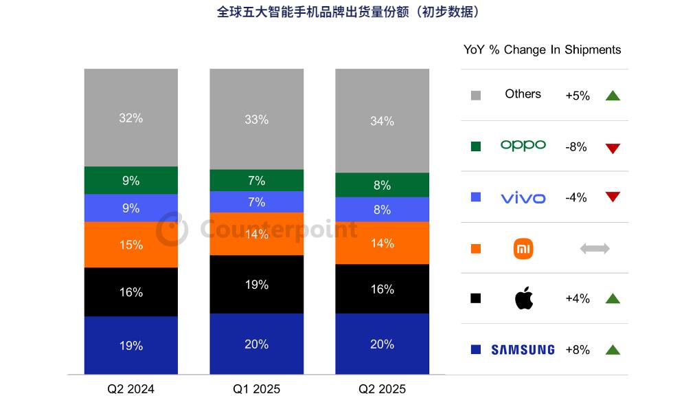 根据Counterpoint Research初步估计,2025年第二季度全球智能手机出货量同比增长2%。这是全球智能手机出货量连续第二个季度增长,主要得益于北美、日本和欧洲市场的推动。其中,苹果延续了增长轨迹,在北美、印度和日本强劲表现的推动下,同比增长4%。据预计,随着iPhone 17系列的预期发布以及对生态系统产品捆绑销售的日益重视,苹果将在下半年保持这一势头。
