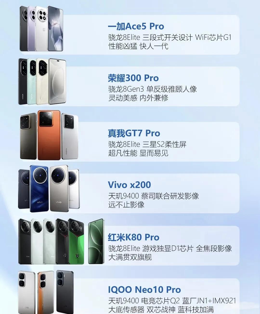 2000-3500元档一加Ace5 Pro搭载骁龙8Elite芯片真我GT7 Pro配备三星柔性屏荣耀300 Pro主打单反级人像拍摄Vivo X200搭载蔡司影像系统红米K80 Pro支持全焦段拍照。