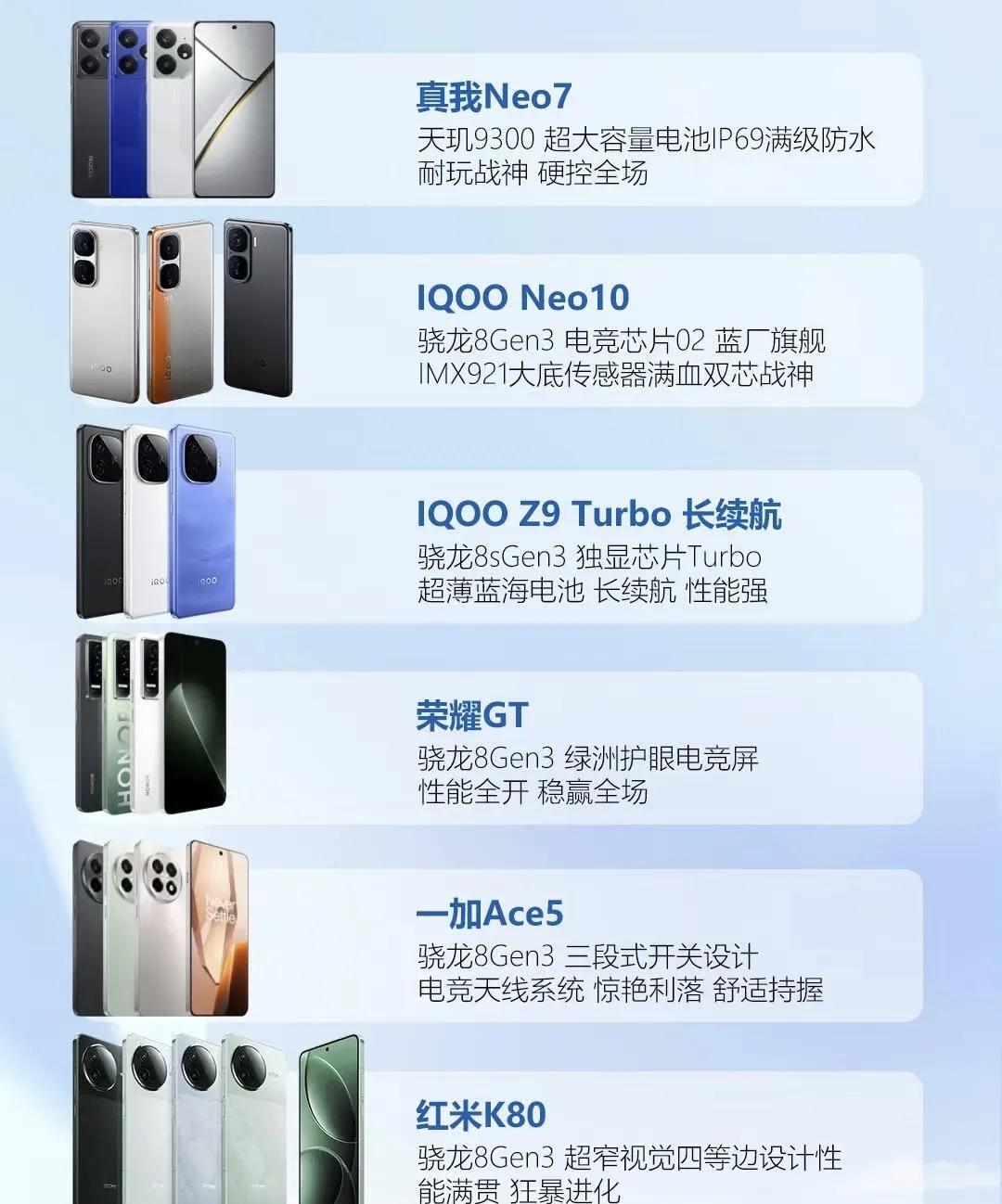 1500-2000元档真我Neo7采用天玑9300芯片IP69防水荣耀GT搭载骁龙8Gen3芯片护眼屏一加Ace5配备三段式开关设计。