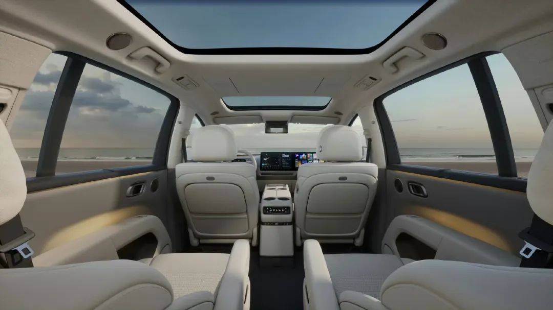 内饰上,更加注重对车内温馨感,比如在前挡风玻璃,车门等处增加了氛围灯;设计了新的隐藏式空调出风口,自动空调出风口扫风范围更大;内饰的配色,细节装饰进行了优化,整体更圆润。座舱上,提供三辐式方向盘,前排两个等尺寸的3K高清显示屏,配备高通骁龙8295P芯片,并辅助超高清HUD。后排提供的吸顶娱乐屏,虽然材质换成了LCD,但尺寸同步增大,中岛台下方为冰箱。