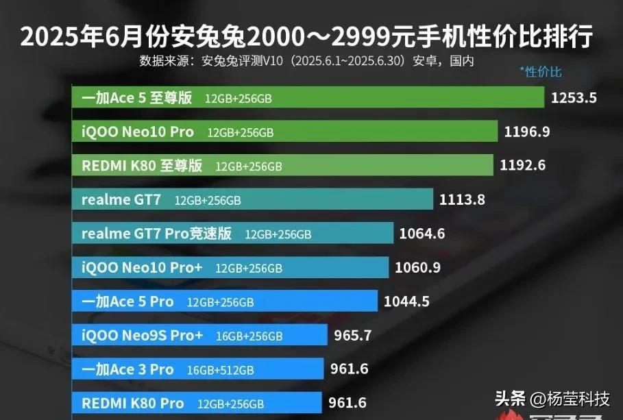 从安兔兔公布的6月性价比排行榜来看,一加Ace 5至尊版成功占据榜首,性价比总分达到1253.5,成为2000-3000价位段的性价比领先机型。其性价比较高的核心原因在于价格较为亲民,原本发布价为2499元,叠加相关补贴后,目前部分版本价格可低至2039元,在同价位中具有一定竞争力。