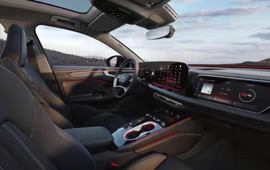 进入车内最吸睛的要数全新的座舱设计了,新一代奥迪A6L采用了家族化布局,11.9英寸的仪表盘与14.5英寸中控屏构成了曲面OLED联屏,搭配副驾专属的10.9英寸娱乐屏,形成了环抱式的数字界面,在换挡方式上新车也进行了改变,现款的传统飞机挡杆被取消,并换装为全新家族式滑块挡杆,让中央扶手区域变得更为简洁。在内饰用料上,全新一代奥迪A6L加入了真皮面料、镀铬饰条及烤漆面板的组合,配合多色氛围灯的设计,营造出冷峻高级的科技豪华感。