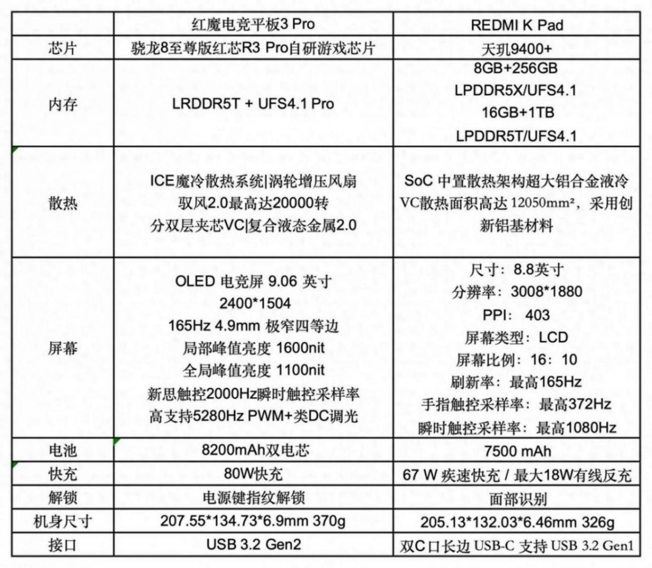 REDMI和主要竞品的参数对比