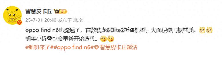 最近数码圈关于OPPO下一代折叠屏旗舰的爆料突然多起来了!博主@智慧皮卡丘 近日透露,OPPO Find N6的研发进度明显提速,新机将成为首款搭载骁龙8 Elite 2的折叠屏机型,并且会大面积使用钛材质。同时,明年OPPO的小折叠产品线也会重新开始迭代。特别值得注意的是,在爆料中被问及“超大杯(通常指影像顶配版)镜头质(凸)起控制得怎么样?”时,@智慧皮卡丘 非常肯定地强调:“oppo是最薄的。”