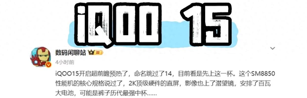 网络爆料:历代最强中杯官宣,iQOO 15系列安卓最强芯片,全能水桶大满贯,KPL指定最强游戏机,这不就来了吗?