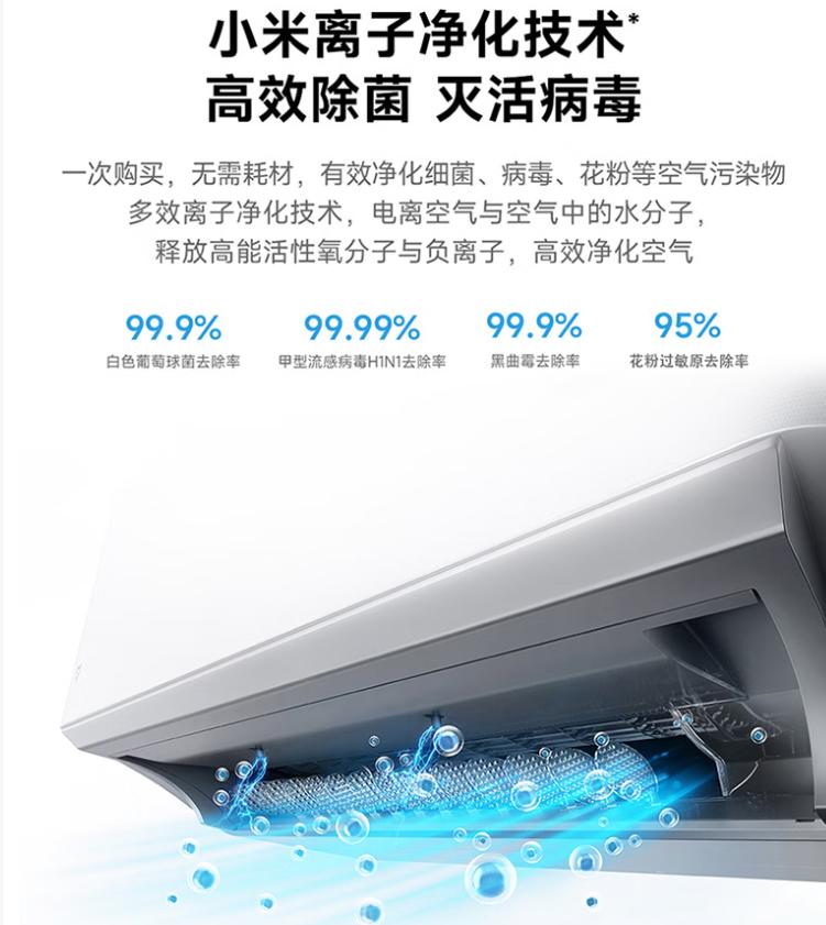 光风舒服还不够,空气干不干净更重要!这款空调搭载了 “小米离子净化技术”。简单说,就是它能释放带电粒子(离子),主动去捕捉、破坏空气中飘浮的坏东西。