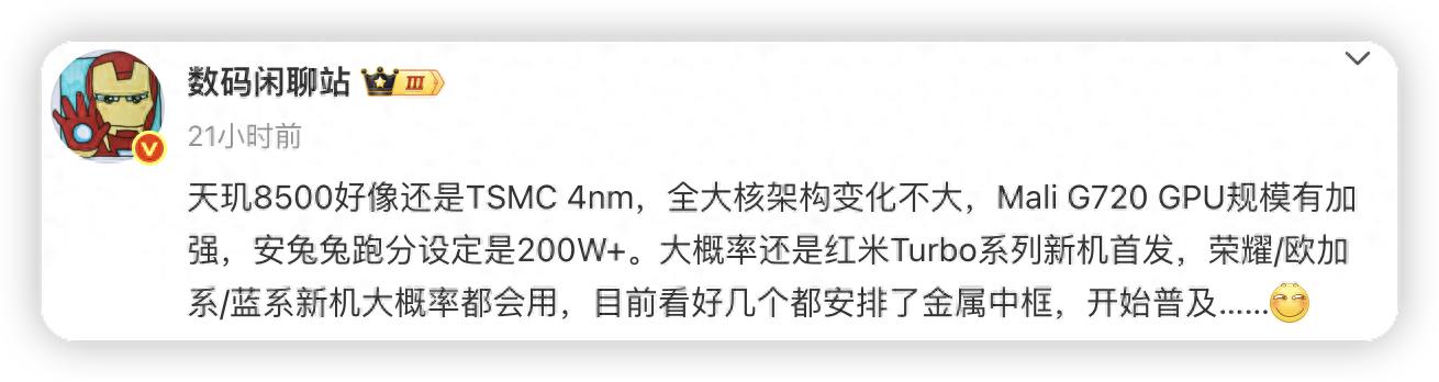 最近站哥终于爆出了天玑8500的消息,据悉其好像还是台积电4nm工艺,CPU部分继续采用全大核架构,Mali G720 GPU规模提升,安兔兔跑分设定超200万,这个成绩和骁龙8 Gen3相当,天玑8400的成绩则在170万左右,这个性能提升幅度还是足以让人满意的。