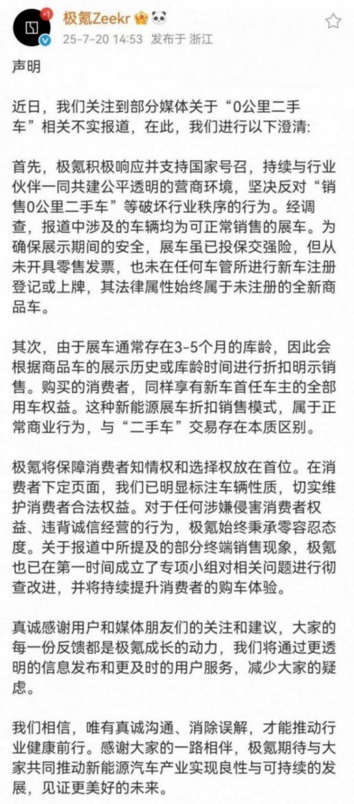 7月19日,《中国证券报》刊发了题为《“0公里二手车”炮制虚假繁荣,极氪公司户销量异常疑云难消》的报道,披露了极氪将数千辆新车卖给公司户,再由第三方公司当做新车卖给消费者的情况。