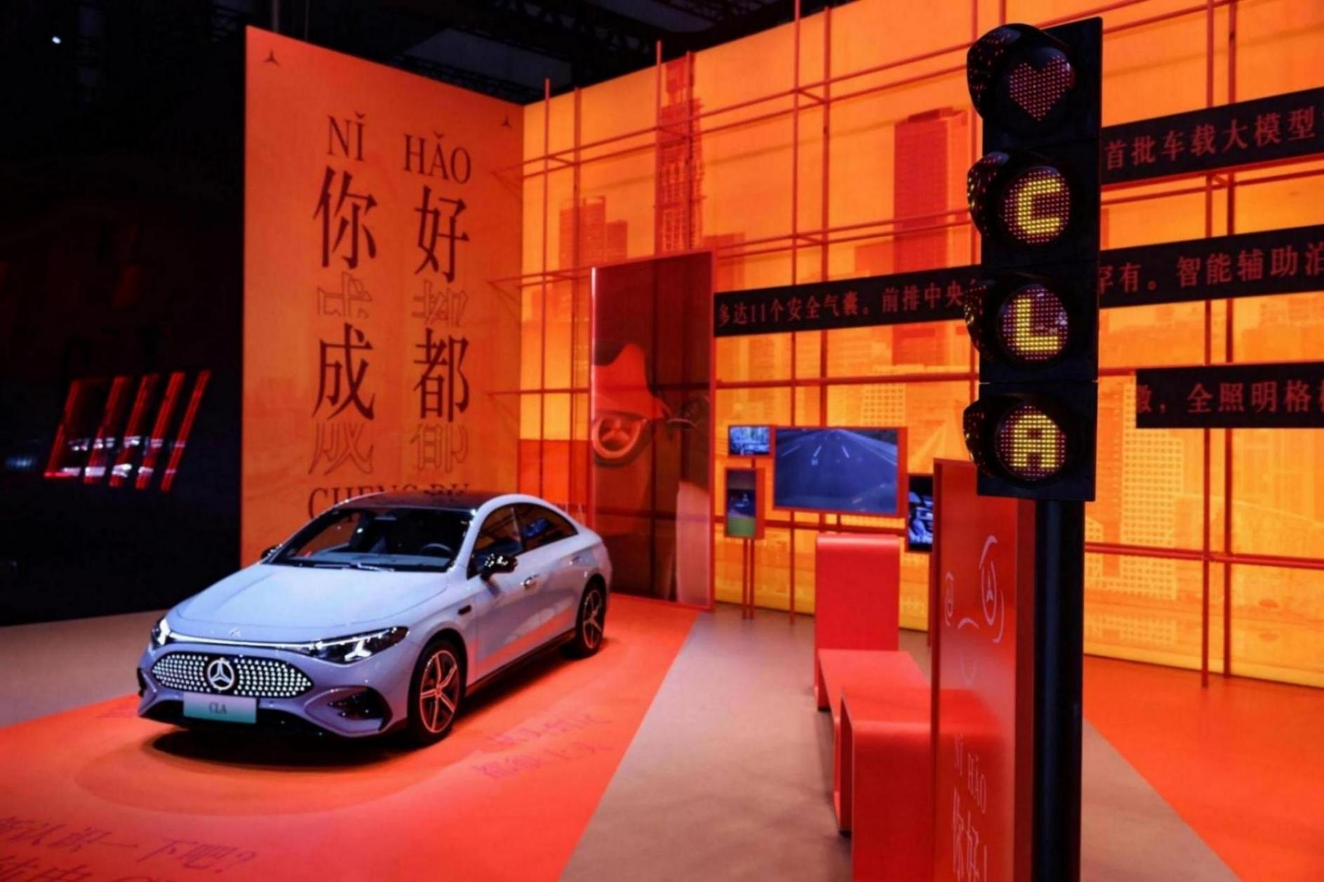 展台布置上,奔驰围绕全新纯电战略级新品CLA,打造了一个时尚街区,用橙色的灯光营造出热烈又有活力的氛围,“你好,成都”字样搭配城市建筑图案,更突出奔驰对于此次成都车展的用心。