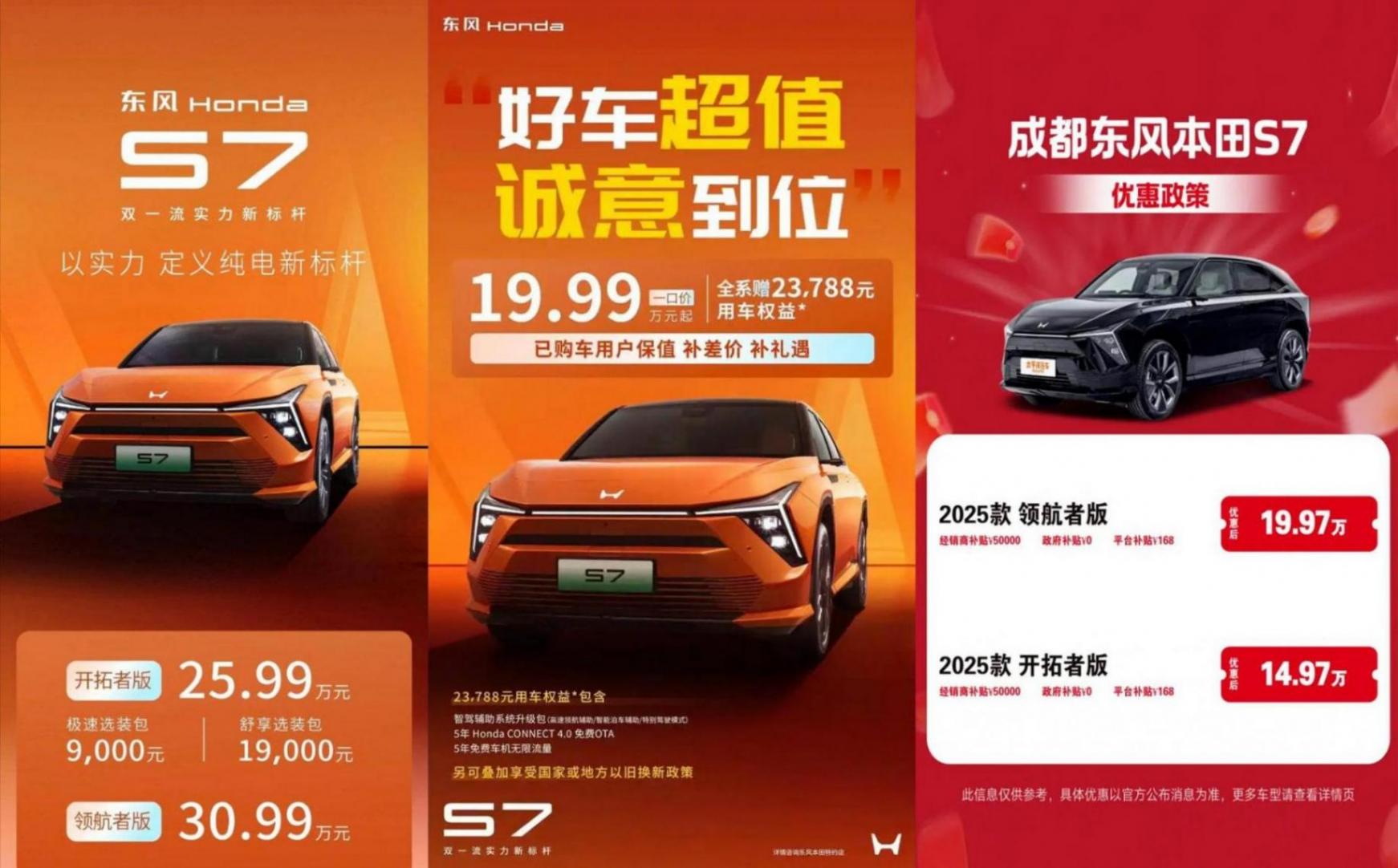 第一,在全国都在一口价的时代,东风本田S7还在玩儿价格套路。这款车从上市到现在经历了3次价格调整。上市初期定价 25.99 万元起,却被吐槽 “配置不及 20 万级国产纯电”!首次降价 6 万暴露初期定价失误,后续频繁让利沦为 “补锅式” 补救,反而印证产品力与价格不匹配。去年低在部分地区的价格,叠加各种补贴之后,甚至已经到14.97万元了。 所以三次大促直接将前期定价打回原形,形成 “老车主受损、新车主观望” 的恶性循环,口碑持续恶化!