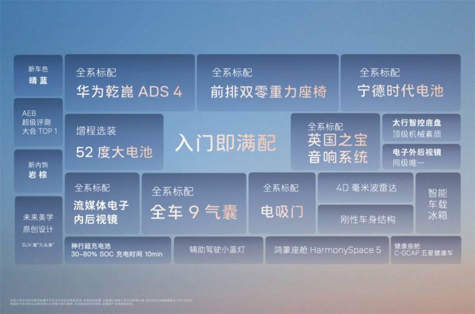 在安全方面,阿维塔07 2026款全系标配9安全气囊,总体积约360L。其中,远端气囊位于主副驾之间,可有效防止乘员二次碰撞;后排侧气囊则进一步提升了全员保护范围。新车还全系升级CAS 4.0全向防碰撞系统,提升主动安全水平。电池层面,全系标配宁德时代电池,搭载NP无热扩散技术,实现“不起火、不爆炸、无热扩散”,保障用车无忧。