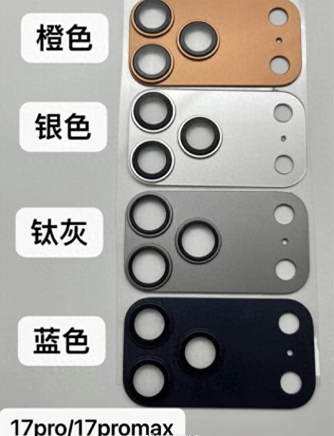 7月25日,据媒体报道,博主Majin Bu在社交平台上晒出了iPhone 17 Pro的镜头盖板,一共有4款配色,分别是橙色、银色、钛灰和蓝色,其中橙色的辨识度最高。