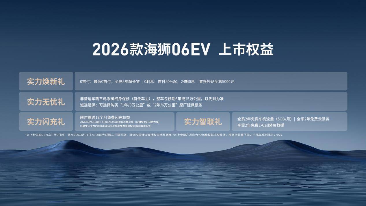 从全新闪充和第二代刀片电池为主的颠覆性技术赋能,到智能、舒享、颜值、驾控、安全的五大维度升级,2026款海狮06EV此次焕新,无疑是一次全方位、高标准的自我超越。它不仅体现了比亚迪在新能源技术领域的硕果,更精准满足了当下消费者的高品质出行需求。我们相信,2026款海狮06EV将继续引领市场风潮,陪伴更多家庭用户开启更加美好的绿色出行新篇章。目前新车已抵达比亚迪海洋网各大门店,欢迎用户到店品鉴试驾。