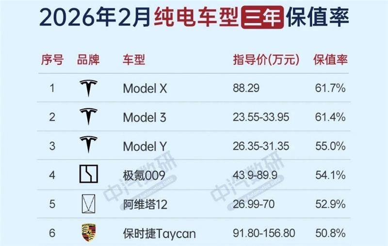 最近中国汽车流通协会与精真估联合发布《2026年2月中国汽车保值率研究报告》,数据显示纯电车型三年保值率排名前三的选手分别是特斯拉Model X、Model 3和Model Y,三年保值率分别为61.7%、61.4%和55%。排在其后的车型有极氪009、阿维塔12、保时捷Taycan、荣威iMAX8、腾势D9、比亚迪海鸥等,再往后的车型三年保值率不足50%。
