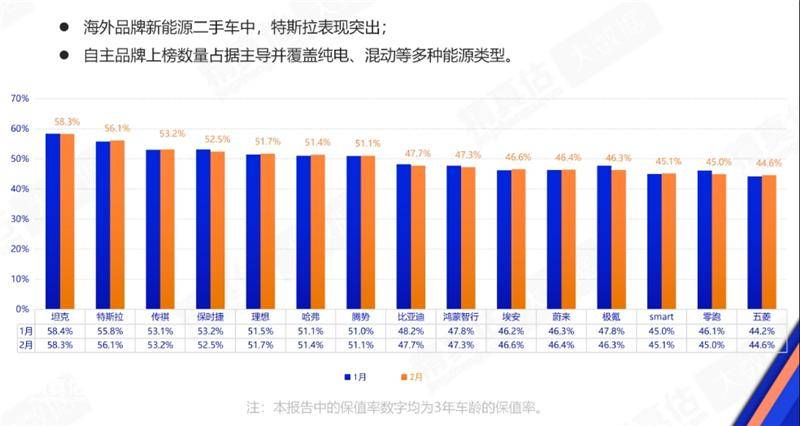 即便是放眼整个新能源市场,包括纯电、混动等车型整体来看,特斯拉品牌的新能源车三年保值率,也是十分领先的。从图表中今年1月和2月的保值率数据我们能够看到,坦克排第一,特斯拉第二。坦克品牌新能源车以混动为主,并且主要定位硬派越野SUV市场,有特殊保值属性,而特斯拉的Model 3、Model Y,则是妥妥的常规家用车型,因此这同样印证了特斯拉在主流家用市场的保值冠军地位。