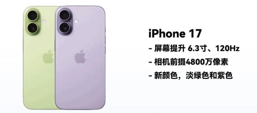 最后是iPhone 17标准版,这次标准版有一个史无前例的升级,就是屏幕升级到了120Hz刷新率。虽然没有Pro同款的自适应刷新率,但也让手机的丝滑流畅度,大大提升了一个等级。其他配置的话,可能是A18 Pro处理器,后置48Mp主摄+12Mp超广角,继续是双摄设计。