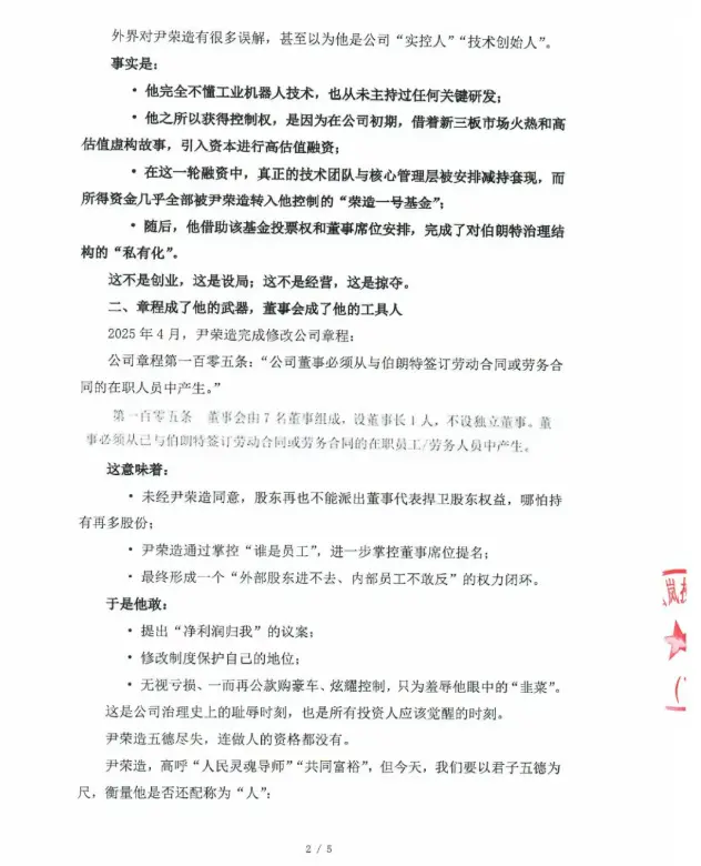 李博铮更是直接表示,“尹荣造根本不是这家公司的缔造者,不是技术创始人,他是靠制度设计掏空伯朗特的人。他完全不懂工业机器人技术,也从未主持过任何关键研发。这不是经营,这是掠夺。”