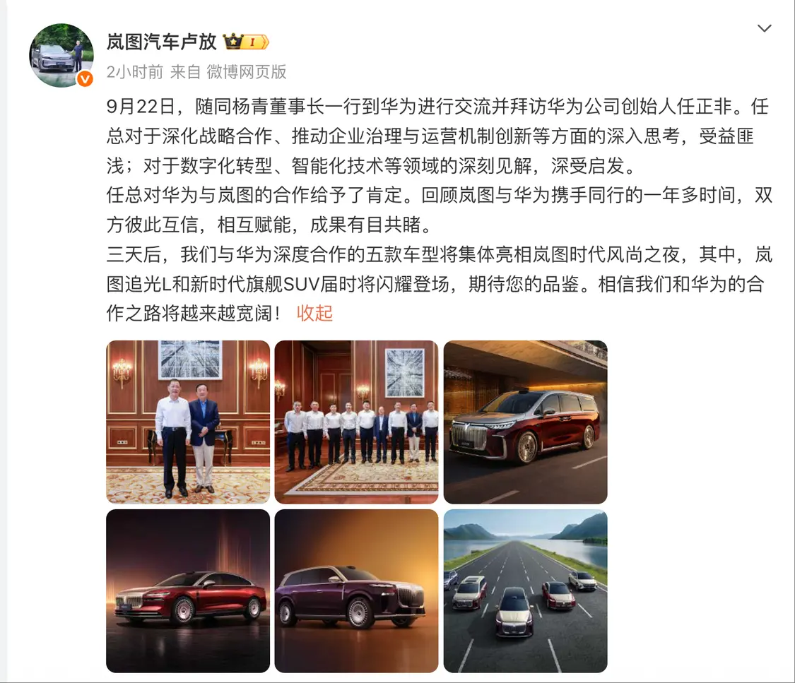 9月23日,岚图汽车科技股份有限公司CEO卢放发文称,三天后,与华为深度合作的五款车型将集体亮相岚图时代风尚之夜,其中,岚图追光L和新时代旗舰SUV届时将登场。