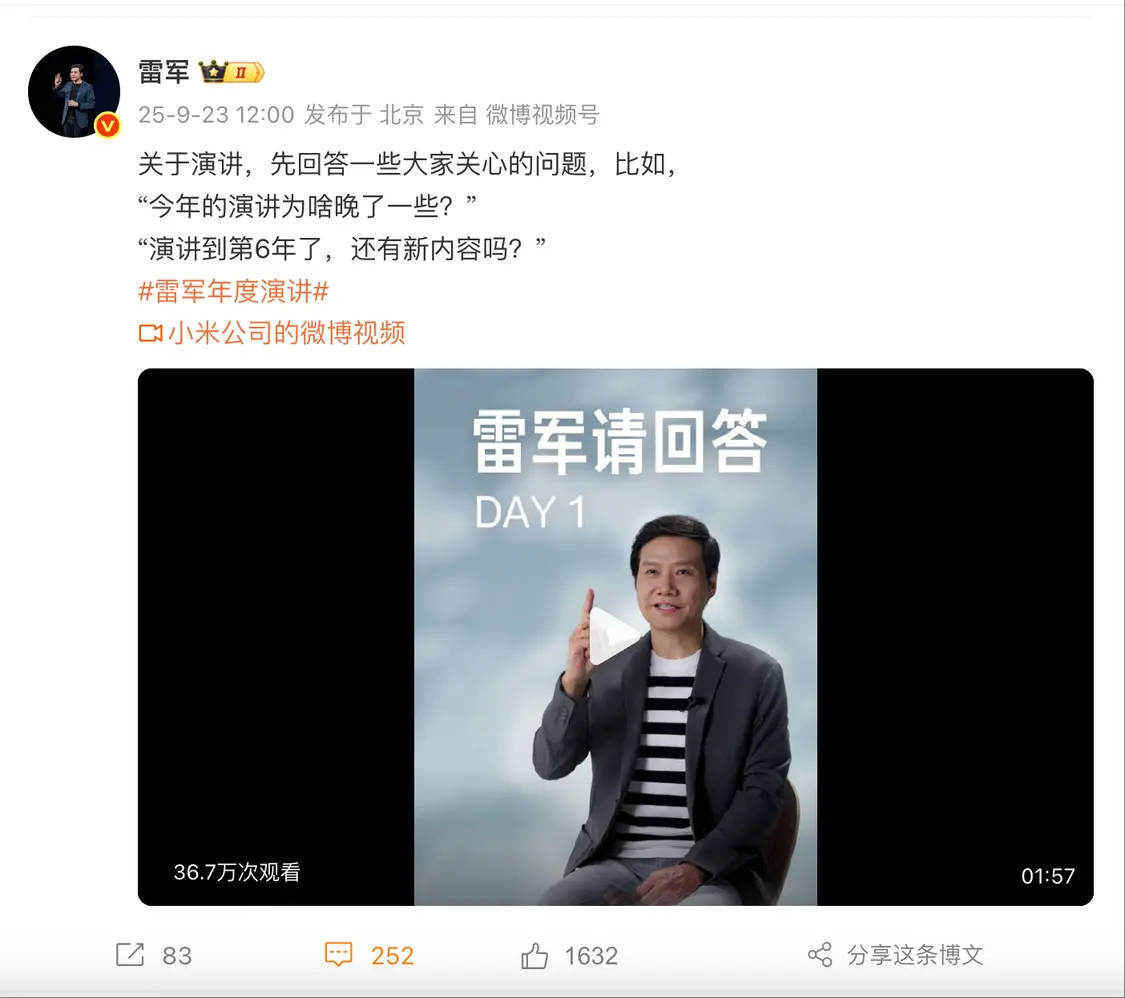9月23日,小米CEO雷军发布了一段“年度演讲”的预热视频。在视频中,当谈及为何今年的演讲比往年晚了一些?雷军解释到,原计划是今年6月份和小米YU7的发布会一起办,但是这次发布会内容实在太多,时间也特别特别长,所以临时推迟到9月份,和小米17系列年度旗舰一起发。雷军直言,“当我知道推迟的时候还挺高兴的,因为这样可以蹭一下小米17的流量。”