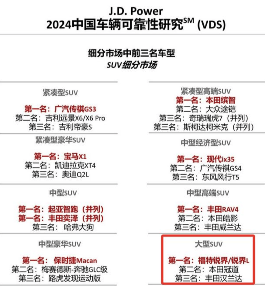 新能源时代,马力变得廉价,但可靠性却变得弥足珍贵。在2025年公布的J.D. Power 2024中国车辆可靠性研究SM(VDS)中,福特锐界L获得大型SUV可靠性第一名。第一批福特锐界L混动版车主有的行驶里程已超10万公里,车辆各项功能正常稳定工作,品质领先同级。