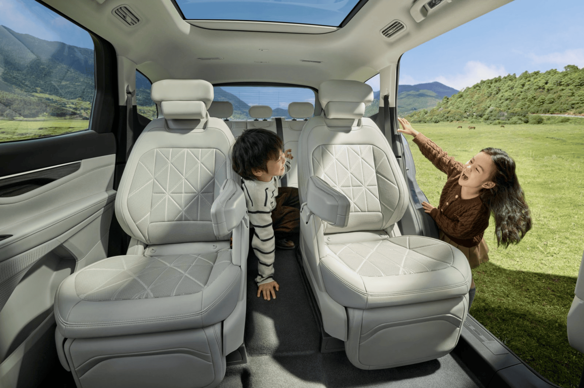 值得一提的是,新车首次搭载半苯胺全粒面豪华真皮座椅,辅以极薄的涂层技术,抗污性强、易打理,有效防止污渍渗透和染色。整个座舱提供同级唯一具备2-2-3和2-3-2座椅布局可选,其中二排采用独立悬浮式座椅,配备同级少有的加热、通风功能,可一键自动调节至“座椅向后41度、腿托向上50度”的近零重力模式。