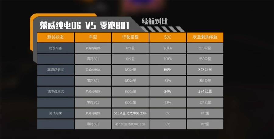 先看最关键的最终成绩:荣威纯电D6满电跑了516公里,续航达成率高达99.23%,几乎跟官方标的520公里没差;而零跑B01官方标550公里,实际只跑了457公里,达成率83.12%。这差距可不是小数目,咱们算笔账:要是一家人开零跑B01去300公里外的亲戚家,来回600公里,得中间充一次电;但开荣威纯电D6,来回516公里足够用,省下的充电时间能多陪孩子玩会儿,多省心!
