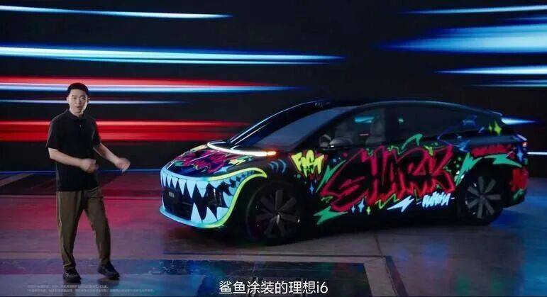 发布会上,李想还亲自揭晓了一款“鲨鱼涂装”的i6。是的,过去路上的理想涂装有玲娜贝儿、冰雪奇缘、小猪佩奇……但如此涂鸦风的理想,还是官方版,恐怕是头一遭。